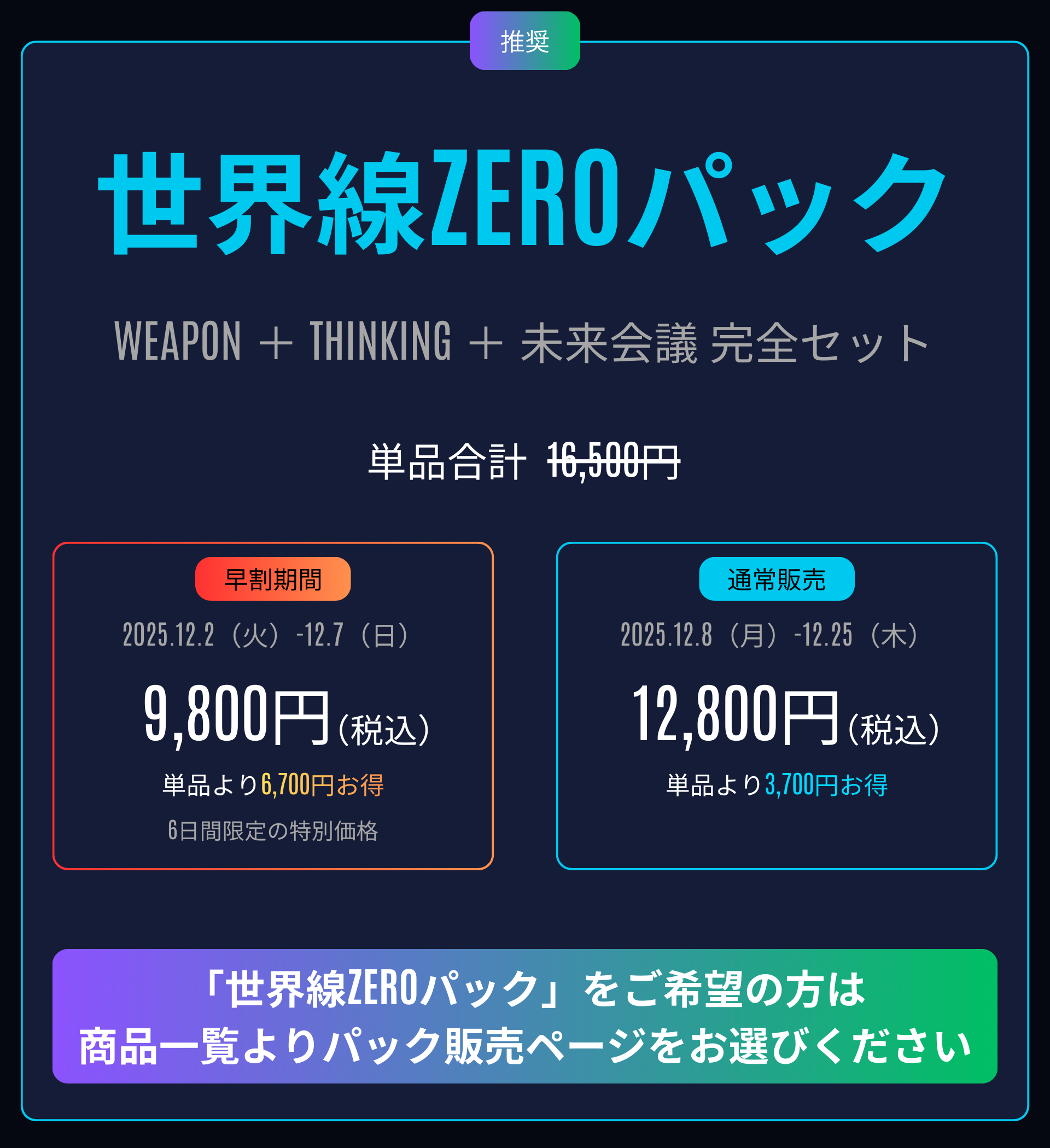 もしあなたが、「WEAPON」や「未来会議」も合わせて学びたいとお考えなら、3つがセットになった『世界線ZEROパック(早割9,800円)』であれば、単品で揃えるよりも【6,700円】もお得に購入可能です。