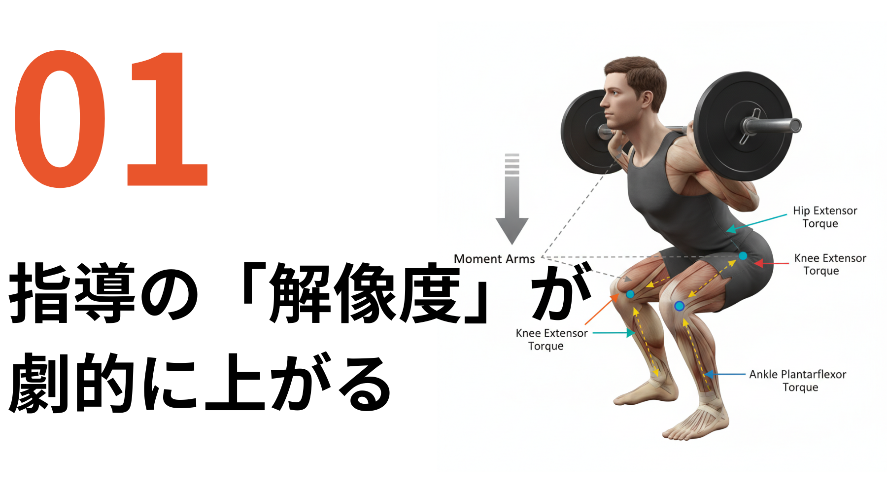 難解な数式を覚えることが目的ではありません。「力」や「ベクトル」をイメージし、実際の指導現場で安全かつ効果的なフォーム指導・負荷設定ができる「実践力」を養うことを目的とします。