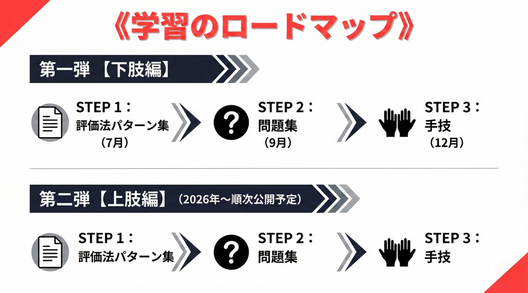 このシリーズは、全身の評価とアプローチを「第一弾:下肢編」「第二弾:上肢編」に分け、それぞれを「①評価法パターン集 → ②問題集 → ③手技」という3つのステップで、2ヶ月おきにリリース