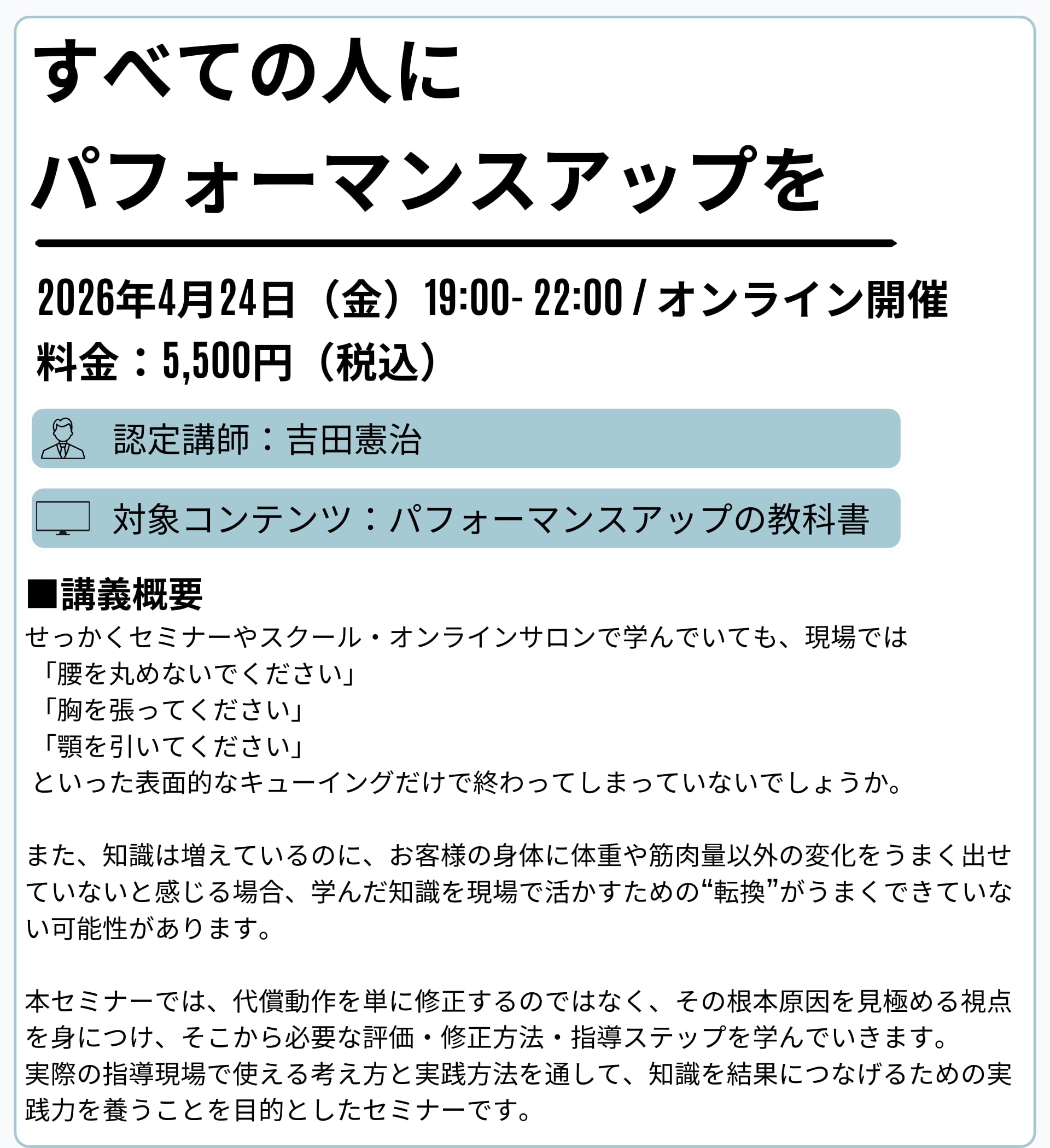 実際の指導現場で使える考え方と実践方法を通して、知識を結果につなげるための実践力を養うことを目的としたセミナーです。